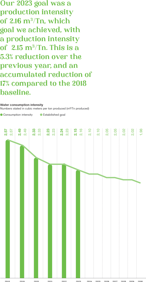 Our 2023 goal was a production intensity of 2.16 m3/Tn, which goal we achieved, with a production intensity of 2.15 m3/Tn. This is a 5.3% reduction over the previous year, and an accumulated reduction of 17% compared to the 2018 baseline.