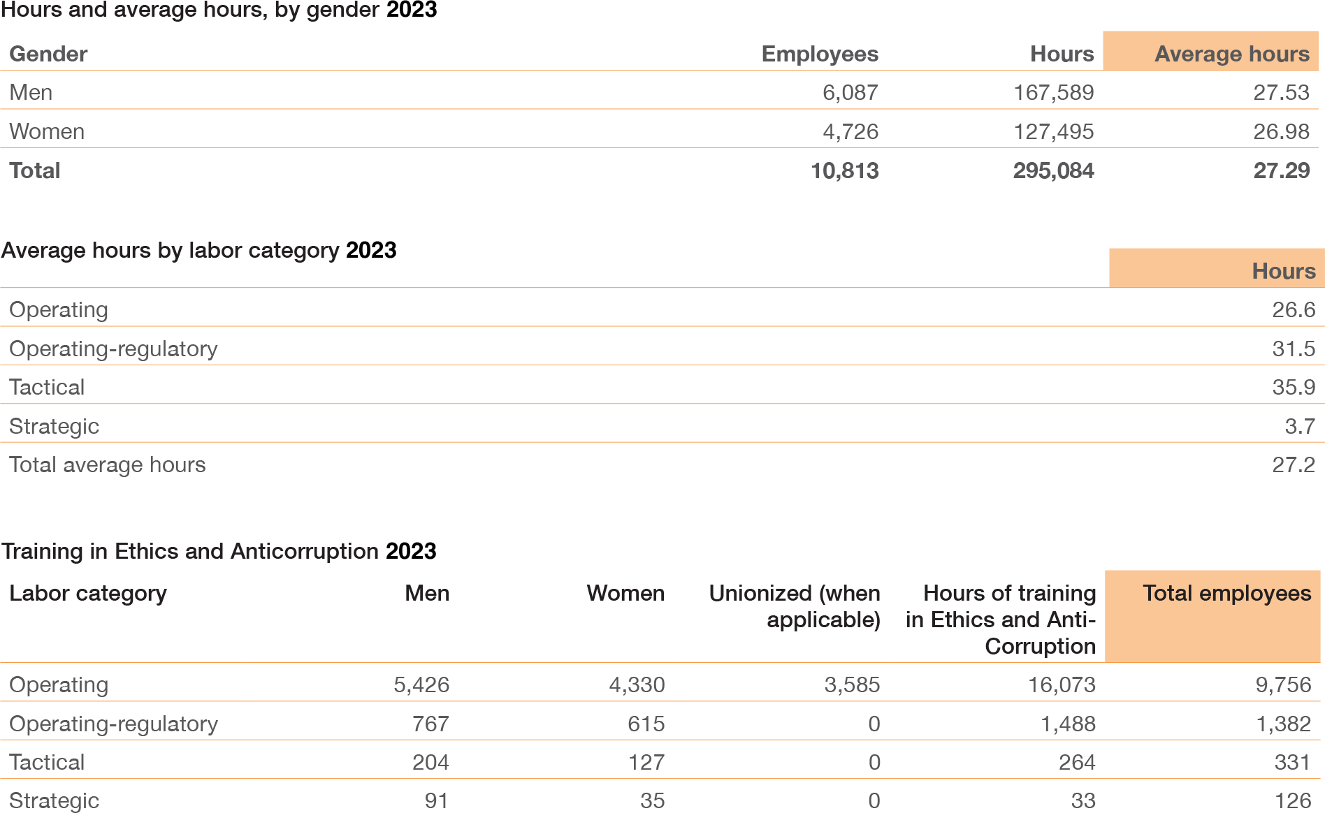 During 2023, we provided 295,084 hours of training to 100% of our workforce in all our locations (plants, distribution centers, corporate offices, sales routes, and stores). We invested more than $18.3 million pesos in programs to develop technical skills, regulations and leadership, sustainability, among others.
