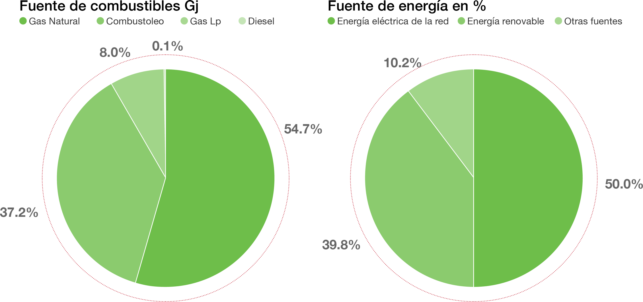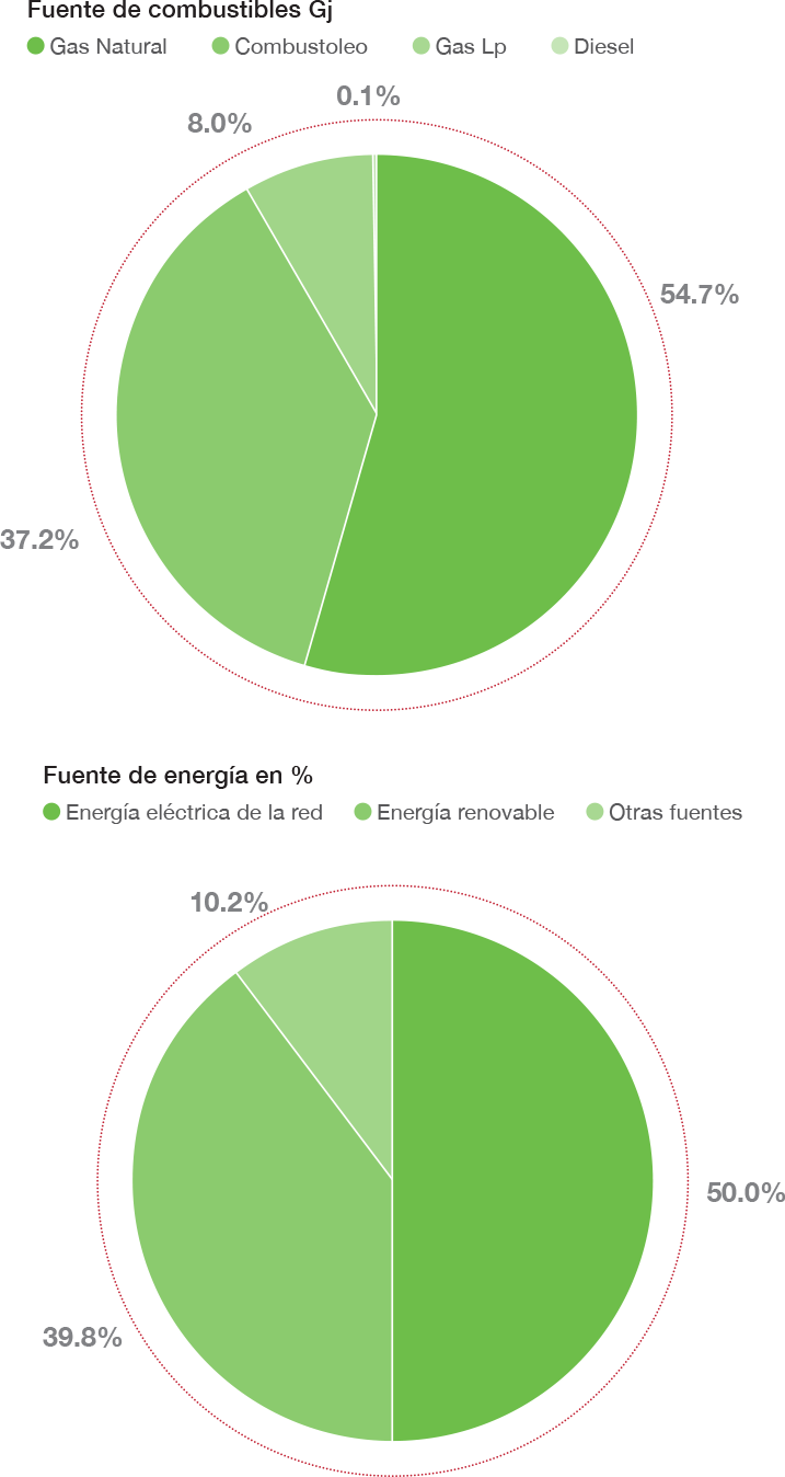 En línea con las metas del ODS 7 Energía Asequible y no contaminante, impulsamos dentro de nuestra operación iniciativas de conservación y eficiencia energética. Durante el año, el ratio de la intensidad energética de las plantas y centros de distribución de Grupo Herdez® fue de 1.77 GJ/Tn producida, lo que representa una reducción del 12.6% en comparación con 2022. El consumo total de energéticos fue de 1,116,257.00 GJ, un 7.8% menos en comparación con el consumo del año anterior. Fue distribuido de la siguiente manera: Energía eléctrica: : 358,761.00 GJ, Combustibles: 757,496.00 GJ. |
