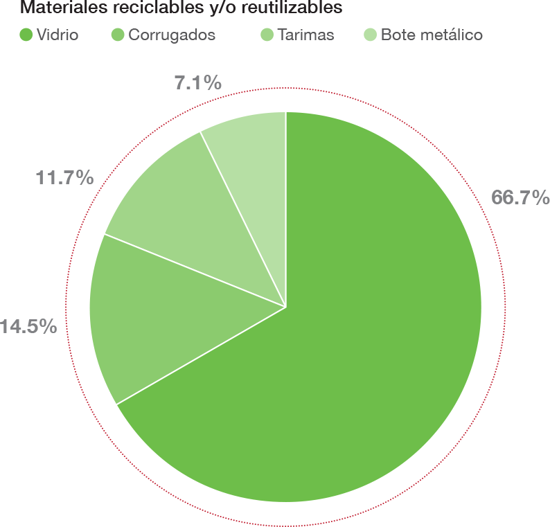 Incrementamos en 2.5% el porcentaje de material adquirido reciclado, comparado con el año anterior. Compramos 12.7% de materiales de empaque reciclados, entre los que se encuentran cartón corrugado en cajillas, cajas y charolas, comparado con el 10.3% de 2022.