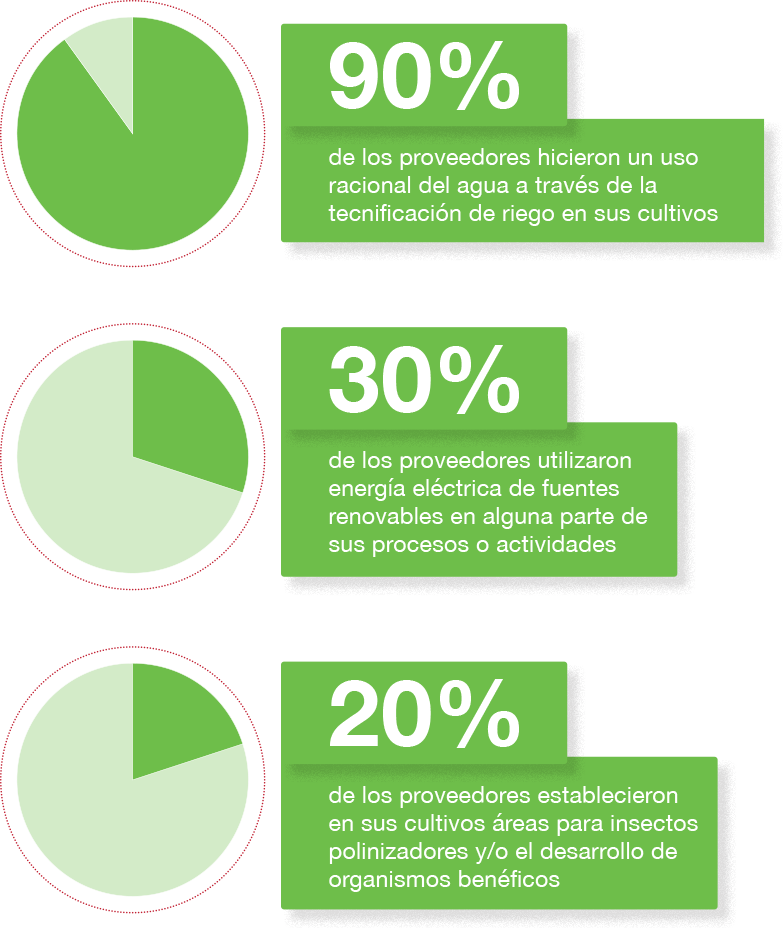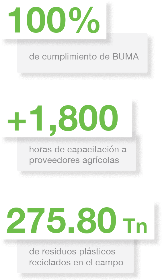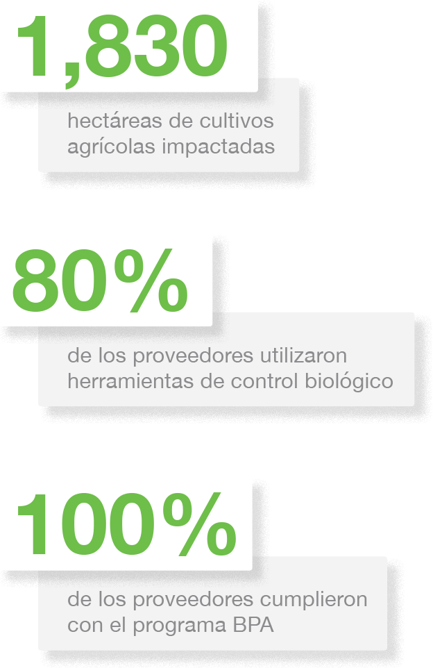Adoptamos prácticas que ayudan a combatir el cambio climático, eficientan el uso de recursos como el agua y preservan la biodiversidad. Nos alineamos a los ODS 2 Hambre Cero y 12 Producción y Consumo Responsable.