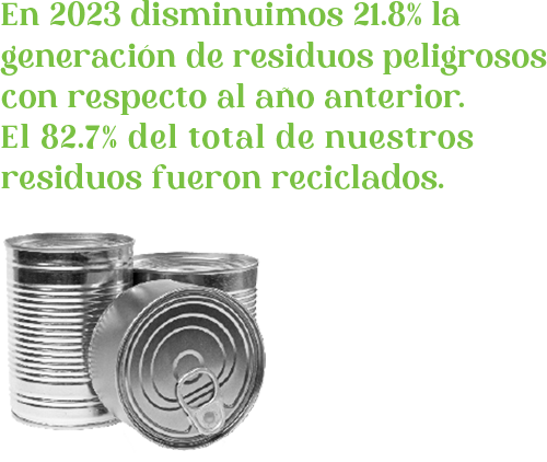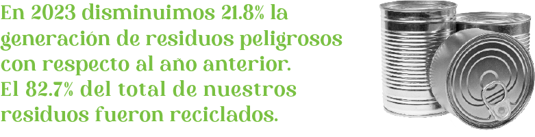 Durante 2023 se recolectaron 15.25 Tn de latas en alianza con Grupo Promesa y, a través del programa Reciclamanía de Walmart, el triple de lo recolectado en 2022. De la mano de Grupo Promesa también se recuperaron 1.7 Tn de vidrio y 156 kg de envases multicapa Tetrapack®.