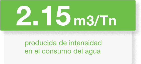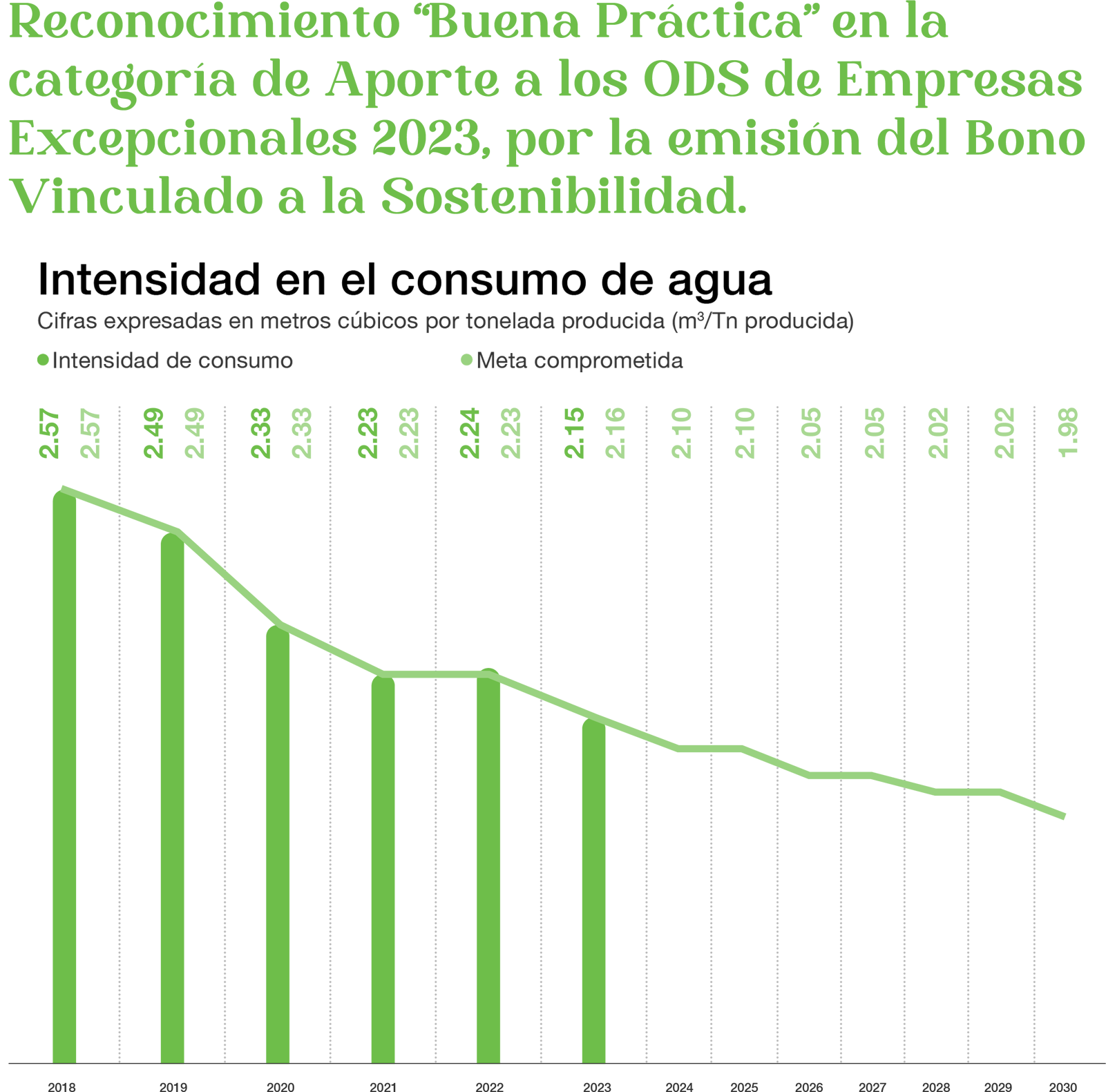 La meta para 2023 fue de una intensidad de 2.16 m3/Tn producida, que cumplimos al lograr una intensidad de 2.15 m3/Tn producida. Esto equivale a una reducción del 5.3%, respecto al año anterior, y una reducción acumulada del 17%, con respecto a la línea base de 2018.
