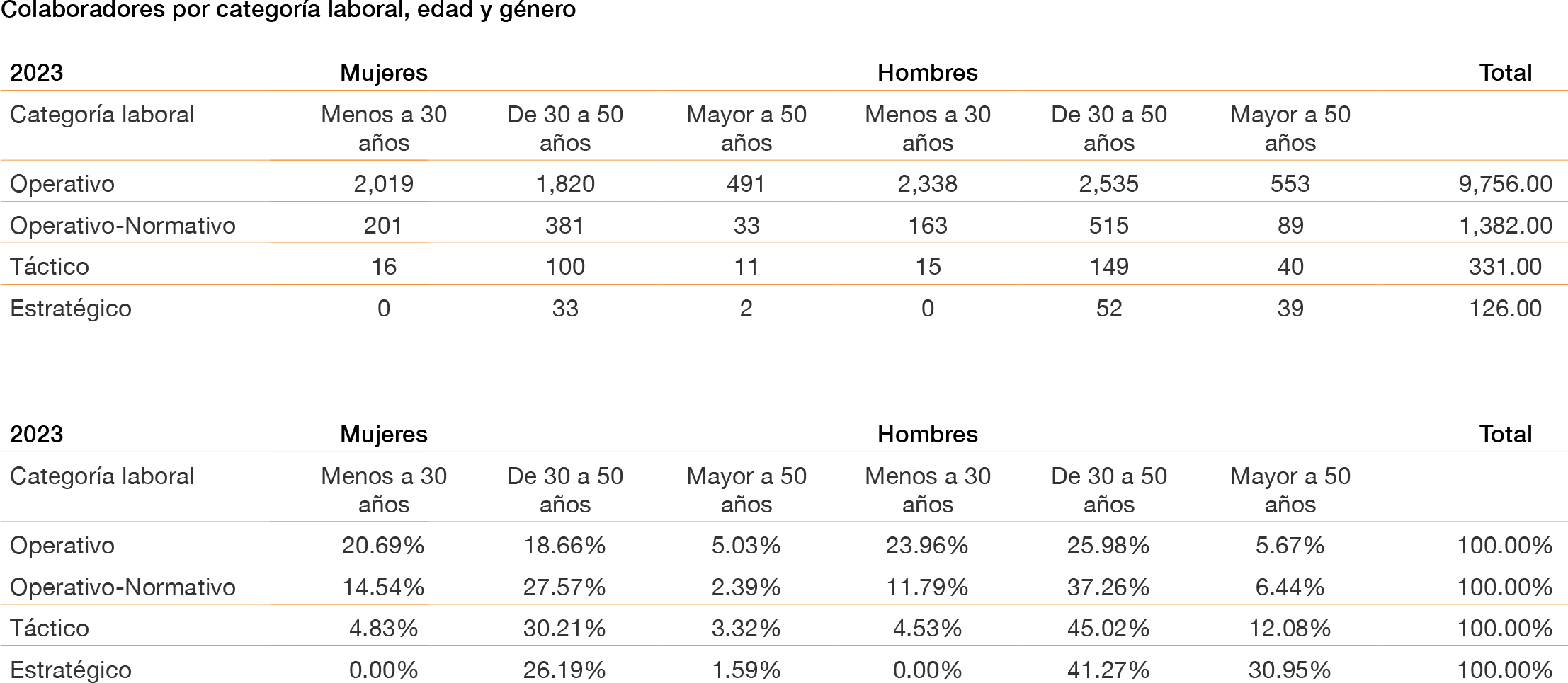 | Categoría laboral | Menos a 30 años | De 30 a 50 años | Mayor a 50 años | Menos a 30 años | De 30 a 50 años | Mayor a 50 años | |