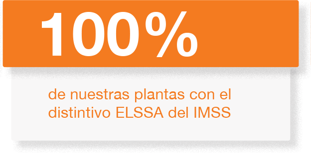 El 100% de nuestras plantas cuentan con el distintivo Entornos Laborales Seguros y Saludables (ELSSA), emitido por el Instituto Mexicano del Seguro Social (IMSS).